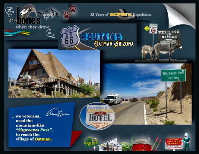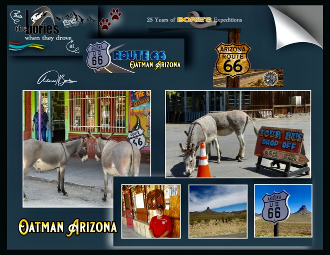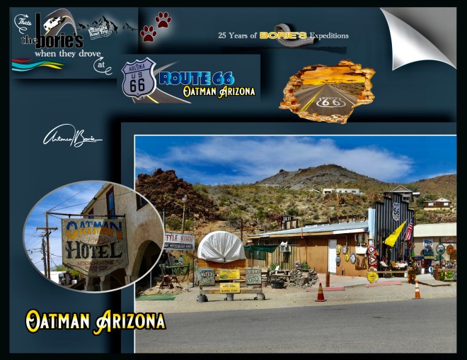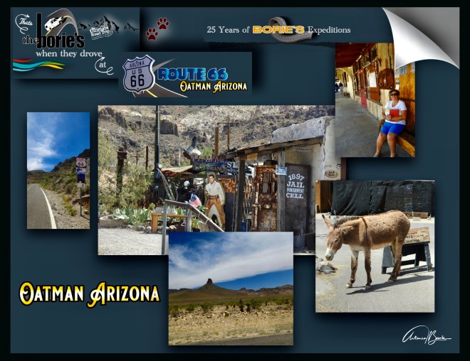 …cruzar as montanhas negras de Mohave, era a única maneira de chegar à aldeia de Oatman, que é uma antiga aldeia de mineração, tal como os viajantes que em tempos usaram a hoje Histórica Estrada 66, localizada numa elevação de 2700 ft / 896m, começando como um acampamento de barracas, logo depois que dois prospectors encontraram um achado de ouro de $10 milhões por volta do ano de 1915, embora a área tivesse sido estabelecida já por alguns anos!.