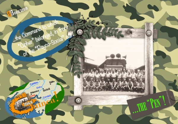 …agora sim, vamos começar a história de sofrimento, do bom companheiro “Caneta”!. A viatura da “Psico-Social”, depois de fazer a sua viagem, quase diária, ficava estacionada, dentro do aquartelamento, perto do local onde nós, a quem nos chamavam “Cifra” dormíamos e, era aí que o “Caneta”, pegando no colchão, no travesseiro e no rádio portátil, ia dormir, quando os ataques de tosse contínua o apoquentavam, e ele não queria acordar ou molestar, com os ruídos da sua tosse, os seus companheiros!. (Now, let’s start the story of suffering, the good companion “Pen”!. The vehicle of the “Social-Psycho”, after traveling almost daily, was parked inside the barracks, near the place where we, who were called “Cipher”, slept, and that was where the “Pen” picking up the mattress, the pillow, and the portable radio, went to sleep, when the attacks of continuous coughing made him sick, and he did not want to disturb his companions with the noise of his cough)!