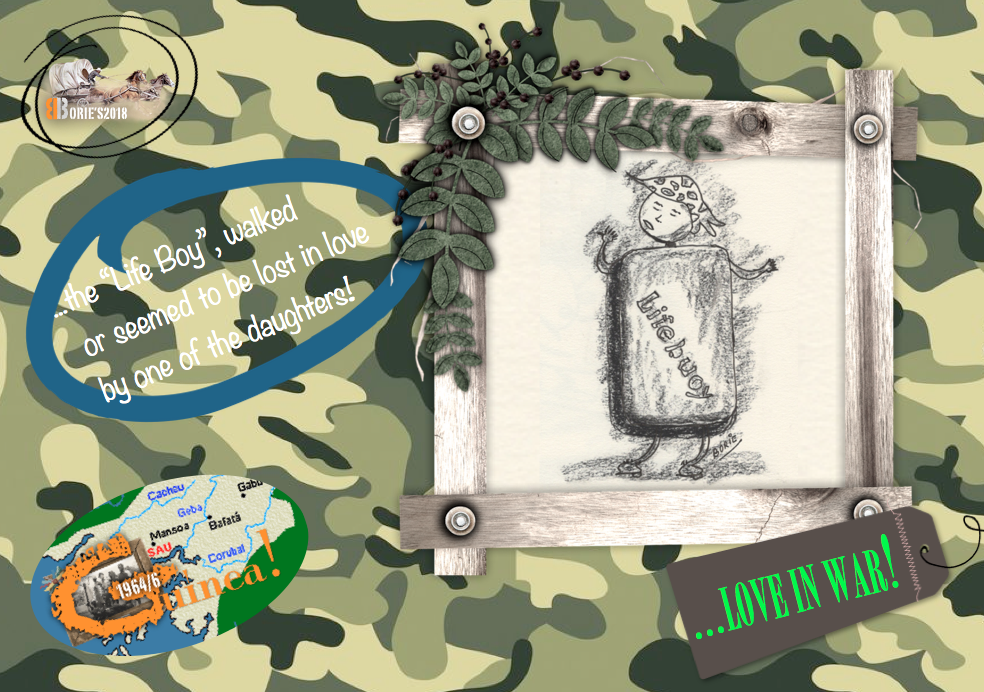 …a verdade, isso vimos nós, com estes olhos que a terra há-de comer, sim eram eles, os dois juntos, o “Life Boy” com a filha do “Libanês”, estavam de frente um para o outro, ela dentro e ele fora do balcão, mas olhando-se de frente, nos olhos, não reparavam em mais ninguém, pois dissémos “bom dia” e ninguém respondeu, estavam concentrados um no outro, com as mãos juntas, passando os dedos um pelo outro, tal com se via nos filmes de Hollywood, falando baixinho, não sabemos nós, se estavam trocando promessas de amor para o resto das suas vidas, ou se o “Life Boy” lhe estava tentando roubar o anel!. Nesse dia cremos mesmo que não, devia de estar pedindo-lhe para convencer o seu pai, para lhe dispensar uma caixa de sabonetes, para vender no aquartelamento, pois pela manhã, pedimos-lhe uma barra de sabão, dizendo-nos ele, que não tinha mais produto e, o navio “Ana Mafalda”, só visitava a então Província Colonial da Guiné, no mês seguinte!. (the truth, this we saw, with these eyes that the earth will eat, yes they were, the two together, the “Life Boy” with the daughter of the “Lebanese”, were facing each other, she in and out of the balcony, but looking straight in the eyes, they did not notice anyone else, for we said “good morning” and no one answered, they were concentrating on each other, hands clasped together, running their fingers one at a time another, as seen in the Hollywood movies, talking softly, we do not know if they were exchanging promises of love for the rest of their lives, if Life Boy was trying to steal the ring!. On that day, we do not think we should be asking him to persuade his father to give him a box of soap to sell in the barracks, because in the morning we asked him for a bar of soap, telling us that had no more product, and the ship “Ana Mafalda” visited the then Colonial Province of Guinea the following month)!.