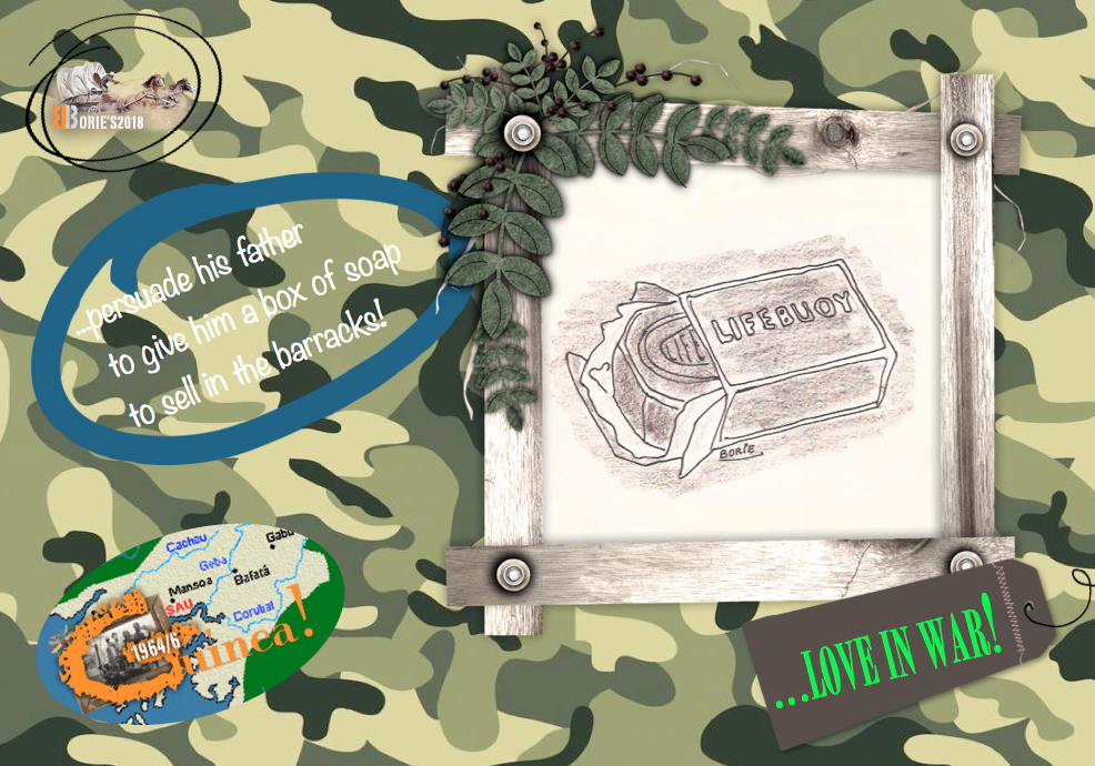 …esta personagem do companheiro de guerra “Life Boy”, negociava dentro do aquartelamento, tudo estava bem para ele, pedia desculpa, trocava os produtos, se podesse cobrava duas vezes, em caso de dúvida, ele era o culpado, emprestava um lance de linha com uma agulha na ponta para pregar um botão, depois, vendia o carrinho de linhas e a agulha, tal como se fossem novos, ia vendendo, no fim do mês cobrava mais uns “pesos” na conta, se dessem por ela, pedia desculpa, se não dessem, era lucro no negócio!. (this character of the war boy “Life Boy”, negotiated inside the quarter, everything was fine for him, he apologized, he exchanged the products, if he could charge twice, in case of doubt, he was to blame, bid a line with a needle at the end to nail a button, then sell the line cart and the needle, as if they were new, were selling, at the end of the month charged a few more “pesos” in the account, if they gave it, he was sorry, if they did not, it was profit in the business)!.