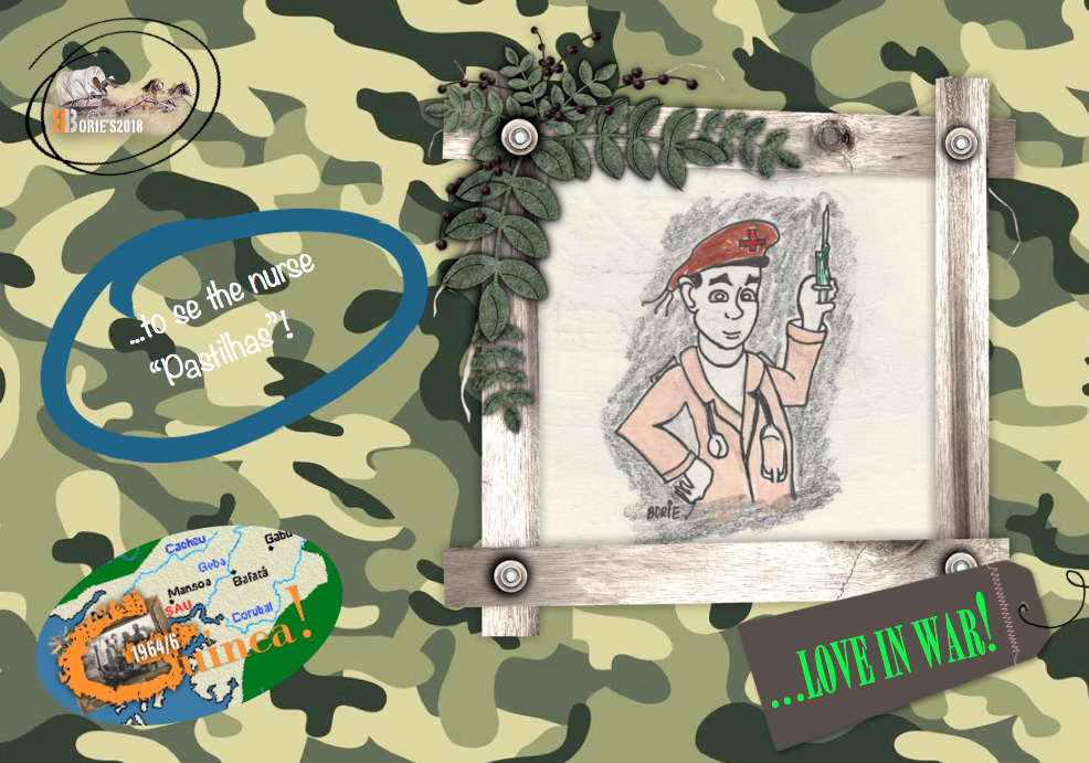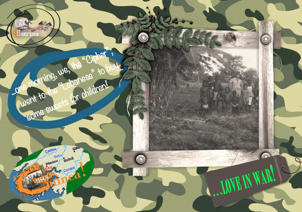 …uma certa manhã, nós, o “Cifra”, fomos ao estabelecimento do “Libanês” comprar alguns rebuçados, pois íamos visitar algumas “bajudas” (moças naturais da aldeia), e crianças a uma aldeia com casas cobertas de colmo, que existiam perto do aquartelamento e, ainda hoje, já lá vão mais de cinquenta anos, não sabemos a certeza se o “Life Boy”, estava tentando roubar um anel muito lindo, com uma pedra azul turquesa, que a filha do “Libanês” usava no dedo, ou se já tinha aprendido a acariciá-la, tal como o “Curvas, alto e refilão” lhe tinha dito anteriormente!. (one morning, we, the “Cipher”, went to the “Lebanese” establishment to buy some sweets, as we were going to visit some “bajudas” (natural girls in the village), and children in a village with thatched houses that existed near the barracks and, even today, more than fifty years ago, we do not know for sure if the “Life Boy” was trying to steal a very beautiful ring with a turquoise blue stone that the daughter of the “Lebanese” wore on her finger, or if already had learned to caress it just as the “Curves, high and complicative” had told him before)!.