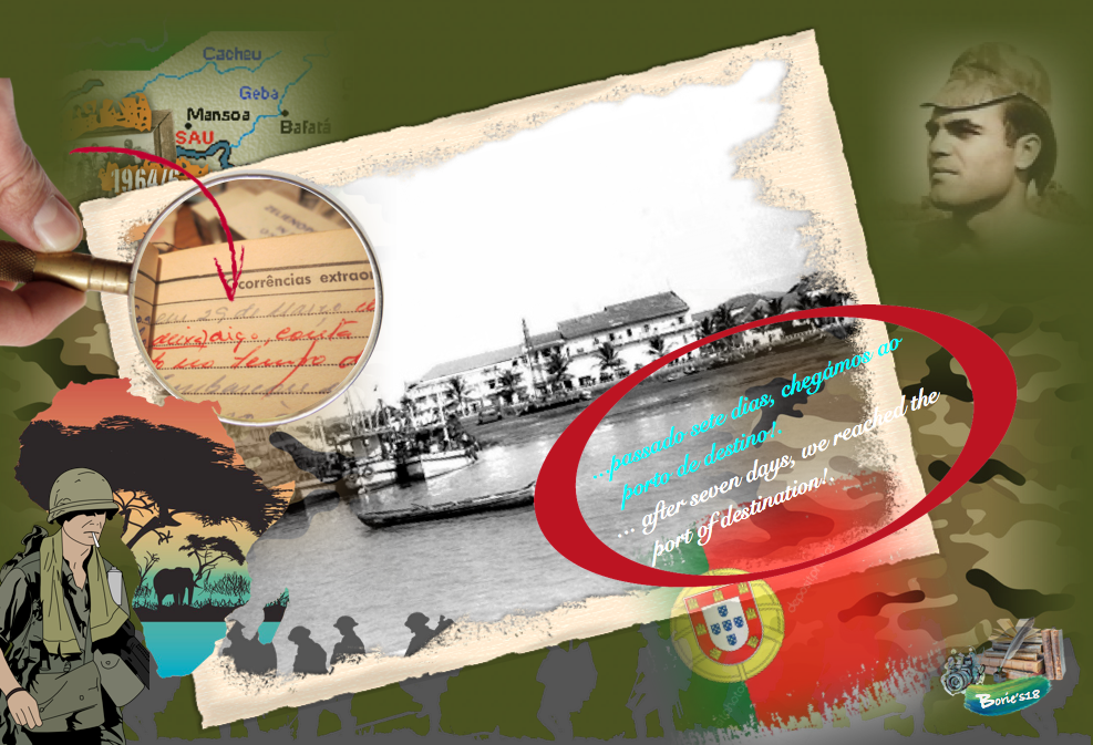 …passado sete dias, chegámos ao porto de destino!. Era manhã cedo, um nevoeiro fraco, mas quente, muito quente e húmido, não corria nenhuma aragem, era abafado!. Lá ao longe, algumas casas, um intenso arvoredo, verde e de outras cores, rente à água, com árvores gigantes aqui e ali!. O cais de desembarque, via-se a umas tantas centenas de metros do barco, não se se podendo atracar, apesar de o barco ser pequeno!. Nós militares, iamos sendo desembarcados em lanchas, que nos transportavam, assim como todo o equipamento militar, até ao cais!. (After seven days, we reached the port of destination!. It was early morning, a faint fog, but hot, very hot and humid, there was no wind, it was stuffy!. There in the distance, some houses, an intense grove, green and other colors, close to the water, with giant trees here and there!. The landing dock, one could see a few hundred meters of the boat, not being able to dock, although the boat is small!. We military men were disembarked in boats, carrying us, as well as all military equipment, to the docks)!.