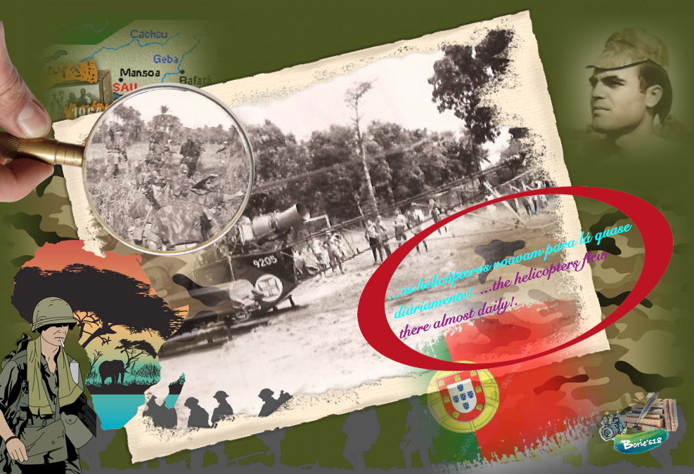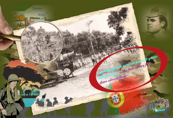 …os helicópteros voavam para lá quase diáriamente, recolhendo doentes, feridos ou mortos, o nosso equipamento militar era inferior ao dos guerrilheiros, começavam a ver a guerra de guerrilha agressiva e violenta, com que os guerrilheiros que lutavam pela independência do seu território usavam, como uma séria ameaça!. Nós falávamos, havia um precentimento em muitos militares das nossas forças de combate, onde se considerava que era uma questão de tempo, pois a aquela guerra estava perdida!. (The helicopters flew there almost daily, picking up the sick, wounded or dead, our military equipment was inferior to that of the guerrillas, they began to see aggressive and violent guerrilla warfare, with which the guerrillas who fought for the independence of their territory they used, as a serious threat!. We were talking, there was a premonition in many of our combat troops, where it was considered a matter of time, for that war was lost)!.