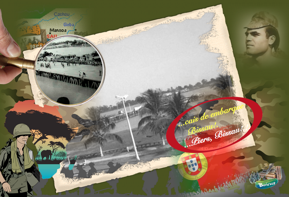 …a coluna militar, percorreu os setenta quilómetros até à capital Bissau, largando o nosso Comando de Agrupamento no cais de embarque!. Aí permanecemos dois dias, tempo que durou o desembarque das tropas novas com o seu equipamento militar e, o embarque das tropas velhas, que era feito em lanchas pequenas do cais para o barco!. (The military column, traveled the seventy kilometers to the capital Bissau, dropping our Group Command at the boarding pier!. We stayed there for two days, a time that lasted the landing of the new troops with their military equipment, and the embarkation of the old troops, which was done in small boats from the quay to the boat)!.