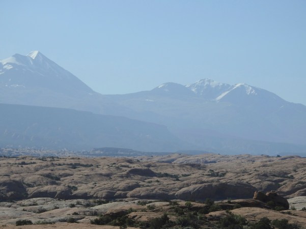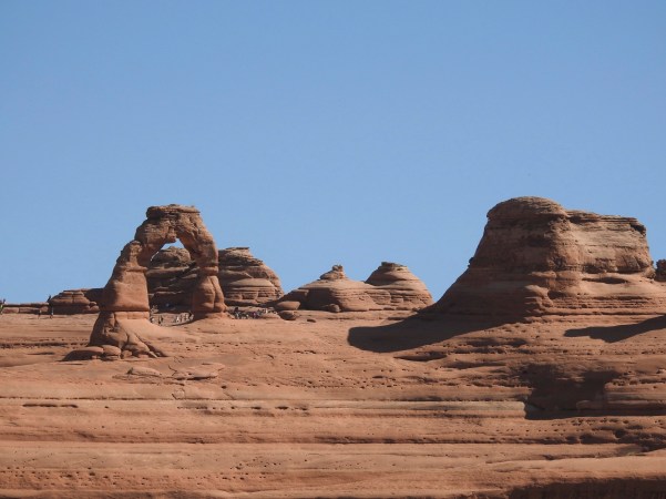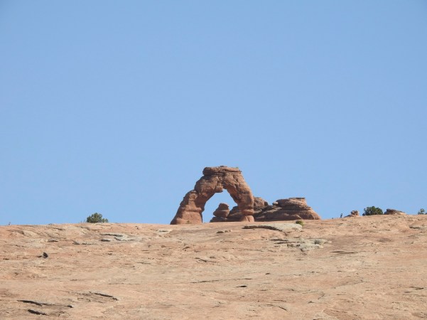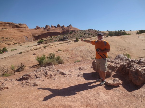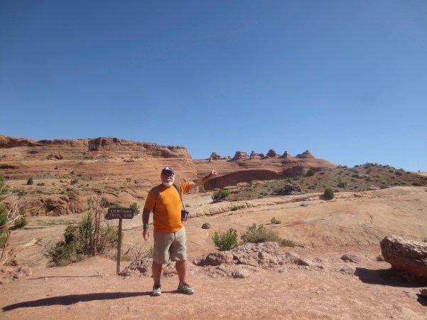 …é difícil ver “Delicate Arch” da estrada principal do parque!. No nosso caso, de pessoas já com idade um pouco avançada, saindo da nossa “White Fox” (caravana), procurámos caminhar numa trilha com uma distância de aproximadamente uma milha no percurso de ida e volta, com escadas improvisadas em pedra e terra, sem danificar o cenário natural, para termos uma visão previlegiada, sòmente obstruída por um pequeno desfiladeiro!. (It’s hard to see “Delicate Arch” from the park’s main road!. In our case, people of a slightly advanced age, coming out of our “White Fox” (caravan), we tried to walk on a trail of approximately one mile in the round trip, with improvised stairs in stone and earth, without damaging the natural scenery, to have a privileged view, only obstructed by a small gorge)!.