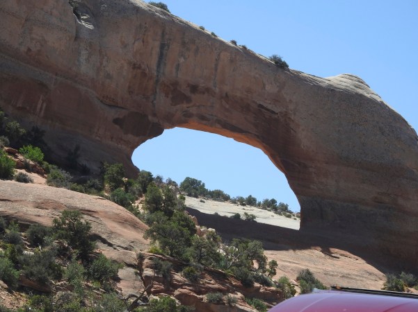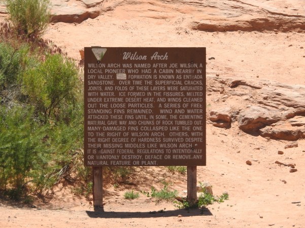 …viajando sempre em direcção ao sul, já no condado de San Juan, com uma elevação de cerca de 1850 pés, (565 m), surge-nos o Wilson Arch (Arco do Wilson), que foi assim batizado em homenagem a Joe Wilson, um pioneiro local que tinha uma cabana próxima, mais propriamente em Dry Valley, (Vale Seco)! (Traveling ever southwards, already in the county of San Juan, with an elevation of about 1850 feet, (565 m), appears to us the Wilson Arch, that was thus baptized in homage to Joe Wilson, a local pioneer who had a cabin nearby, more properly in Dry Valley)!.