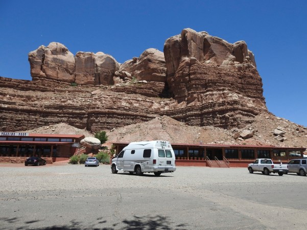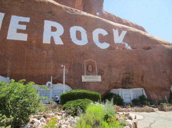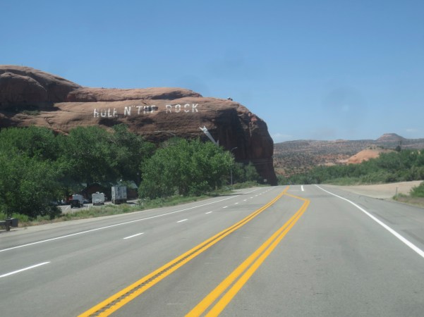 …em grandes letras pintadas na rocha de arenito vermelho, podemos ler, Hole N”The Rock!. (In large letters painted on red sandstone rock, we can read, Hole N”The Rock)!.