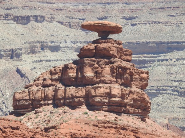 …entretanto chegámos à área designada como Mexican Hat (Chapéu Mexicano) que, para quem viaja do norte, é visível para leste, sobressaindo do topo de uma formação rochosa, cujo nome, bastante incomum, vem de um afloramento de rocha curiosamente sombrio, medindo 18 m de altura por 3,7 m de largura!. (Meanwhile we arrived at the area designated as Mexican Hat which, for those who travel from the north, is visible to the east, standing out from the top of a rocky formation, whose name, quite unusual, comes from a curiously somber rock outcrop, measuring 18 m high by 3.7 m wide)!