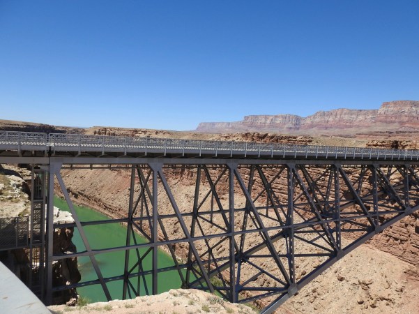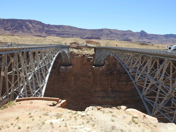 …são duas pontes!. A mais nova transporta o tráfego de veículos na US Route 89A, sobre o Marble Canyon entre o sul de Utah e o norte do Arizona que, como já anteriormente mencionámos, permitindo-nos viajar para uma região remota ao norte do Rio Colorado, incluindo a borda norte do Grand Canyon National Park (Parque Nacional do Grande Desfiladeiro)!. (Are two bridges!. The youngest transports vehicle traffic on US Route 89A, over Marble Canyon between southern Utah and northern Arizona, as we have already mentioned, allowing us to travel to a remote region north of the Colorado River, including North Rim of the Grand Canyon National Park)!.