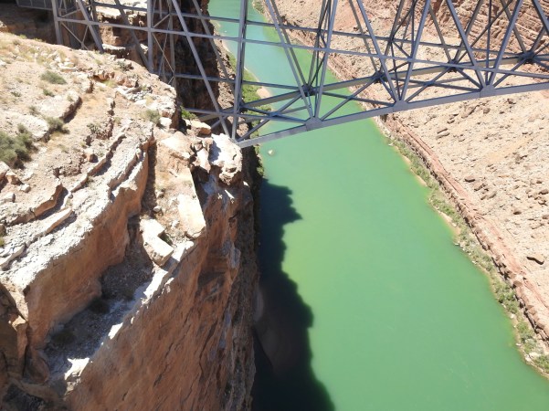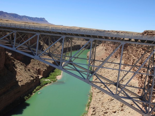 …os dois vãos da Ponte Navajo estão situados em nono lugar entre as pontes mais altas dos Estados Unidos, com alturas quase idênticas de 142 metros para o vão original e 143 metros para o segundo vão e nós, cá de cima, podemos ver lá no fundo o rio Colorado, onde alguns aventureiros navegam, divertindo-se!. (The two spans of the Navajo Bridge are in ninth place among the highest bridges in the United States, with almost identical heights of 142 meters for the original span and 143 meters for the second span and we, from above, can see deep in the Colorado River, where some adventurers sail, having fun)!.