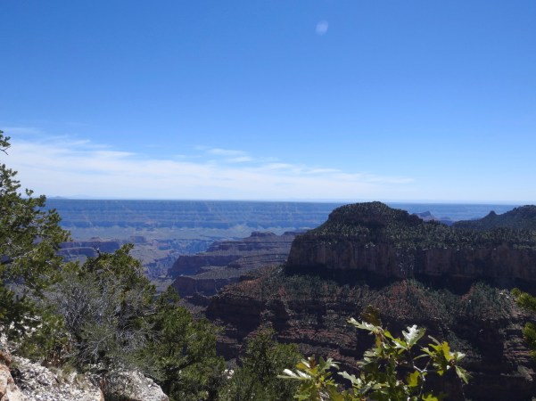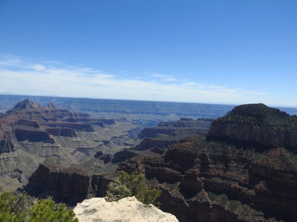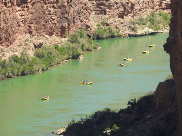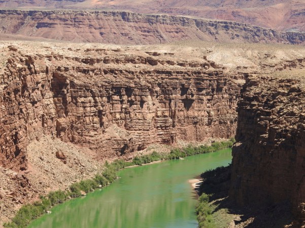 …fomos percorrendo as mais de 277 milhas de comprimento e as 18 milhas de largura que o Grand Canyon tem na sua largura máxima, com mais de um quilómetro de profundidade, vendo aqui e ali o rio que o esculpiu, que é o rio Colorado, que tem apenas 100 metros de largura!. (We were traveling more than 277 miles long and 18 miles wide that the Grand Canyon has at its maximum width, over a kilometer deep, seeing here and there the river that carved it, which is the river Colorado, which is only 100 feet wide)!.