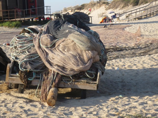 …havia a faina da pesca à “Xávega” no extenso areal Atlântico, da qual mostramos algumas fotos que tirámos muitos anos atrás, numa nossa visita a Portugal, onde na parte sul, os barcos de pesca artesanal efectuavam uma pescaria com rede de cerco composto por longas cordas com flutuadores que terminava num saco de rede cónica!. (There was the task of fishing for “Xávega” in the long Atlantic beach, from which we show some photos that we took many years ago, during our visit to Portugal, where in the southern part, artisanal fishing boats were fishing with a net of siege made up of long ropes with floats that ended in a conical net bag)!.