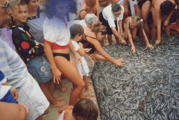 …a faina terminava horas depois, com a chegada ao areal e abertura do saco de rede cónica, que normalmente vinha cheio de peixe, para alegria dos pescadores!. (The work ended hours later, with the arrival on the beach and the opening of the conical net bag, which normally came full of fish, to the delight of the fishermen)!.
