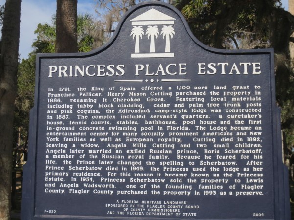 …estamos a falar do “Princess Place Preserve”, que quer dizer mais ou menos, “Lugar Preservado da Princesa” que, tem uma história muito rica, num cenário exótico de beleza natural, onde outrora também foi cenário de índios americanos, assentamentos coloniais, guerras, servos, magnatas, casamentos, divórcios, amor, ódios, príncipes e princesas, tudo passado neste maravilhoso local, situado na parte norte do concelho de Flagler, mais propriamente na confluência do hoje Riacho Pellicer e do Rio Matanzas!. (We are talking about the “Princess Place Preserve”, which means more or less the “Preserved Place of the Princess” which has a very rich history, in an exotic setting of natural beauty, where it was once a American Indians, colonial settlement, wars, servants, tycoons, weddings, divorces, love, hatred, princes and princesses, all set in this wonderful location, situated in the northern part of Flagler County, more precisely at the confluence of today’s Pellicer Creek and the Matanzas River)!.