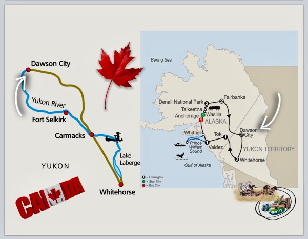 …estávamos em território da província do Yukon, no noroeste do Canadá, a leste da fronteira do estado do Alaska!. Apesar de estarmos no norte, próximos da linha imaginária do Circlo Ártico, a nossa rota continuava em direcção ao norte, em torno do rio Klondike, um afluente que entra no rio Yukon a partir do leste, na distante cidade de Dawson, que era o nosso destino!. Para que se perceba melhor a região por onde seguíamos, o nome Klondike, evoluiu de uma palavra difícil de pronunciar, que significa “água do martelo”, no dialecto das tribos das Primeiras Nações, sendo o resultado dessa má pronúncia que os pesquizadores de ouro adoptaram, na época da famosa corrida ao ouro na região, que começou no ano de 1897 e durou até 1899!.