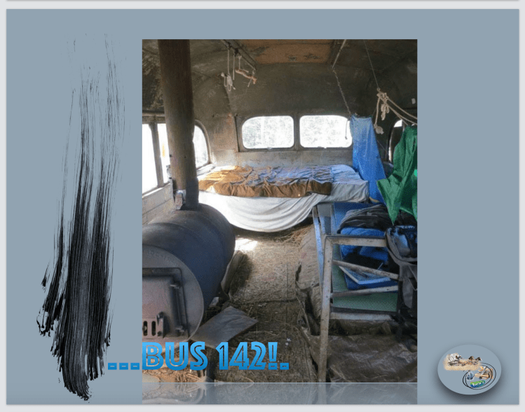 …caminhando por esta trilha coberta de neve, Chris encontrou o hoje famoso autocarro 142 do sistema de transporte da cidade de Fairbanks, abandonado, onde montou o seu acampamento, não demorando muito para que se instalasse, pois não levava nenhum tipo de barraca ou material de acampar e, provavelmente foi um alívio para si quando encontrou este tipo de abrigo!.