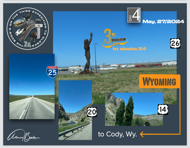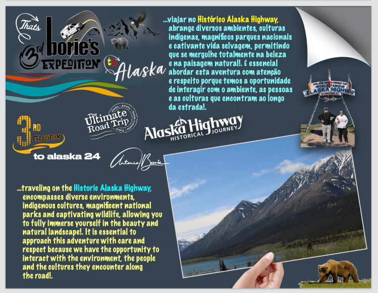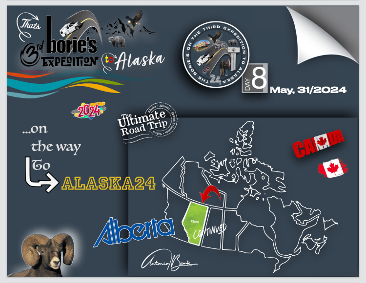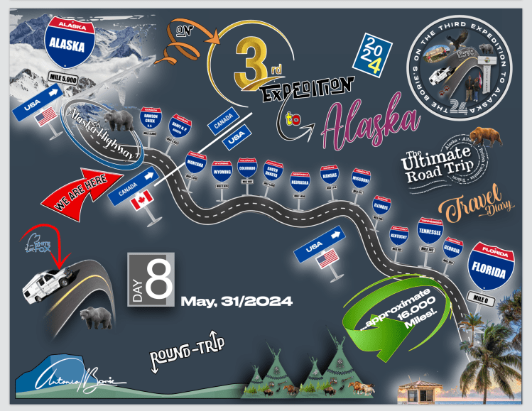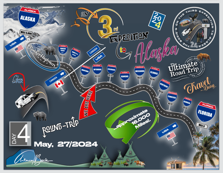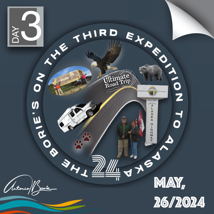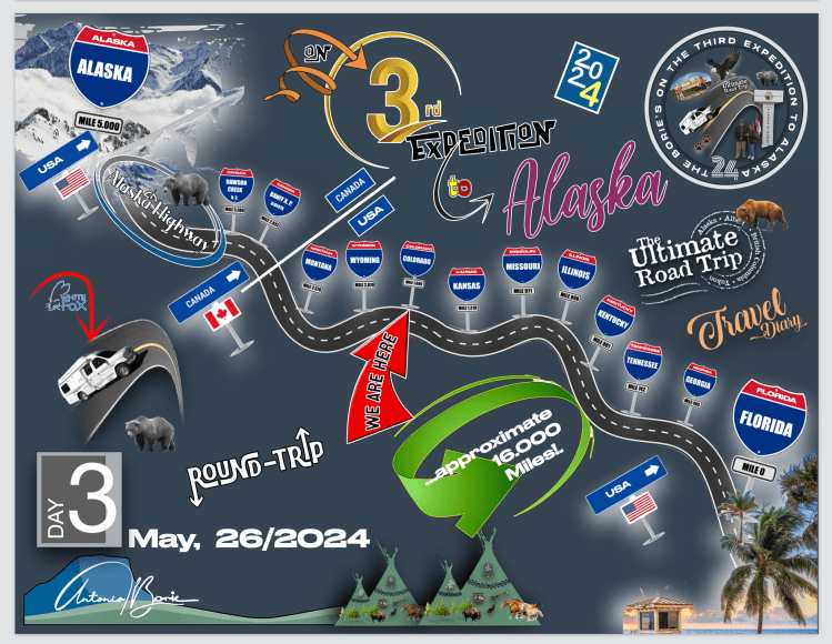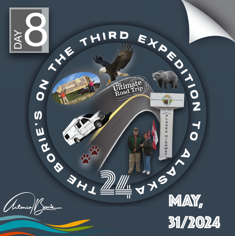 …era o nosso primeiro dia nesta Terceira Expedição ao Alaska, e de repente, percebemos que estávamos aqui, realmente aqui, e poderíamos ir fazer o que quiséssemos!. Isto deixou-nos um tanto atordoados, porque havia tanto para ver e fazer…, e o que seria primeiro?. Decidimos então estabelecer uma meta facilmente alcançável, talvez uma semana mais uns dias, o máximo duas semanas, e para começar viajámos para sul!.