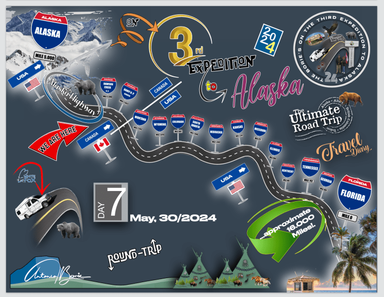 …it was our first day on this Third Alaska Expedition, and suddenly, we realized that we were here, really here, and we could go do whatever we wanted!. This left us somewhat stunned, because there was so much to see and do…, and what would be first?. So we decided to set an easily achievable goal, maybe a week plus a few days, maximum two weeks, and to start we traveled south!.