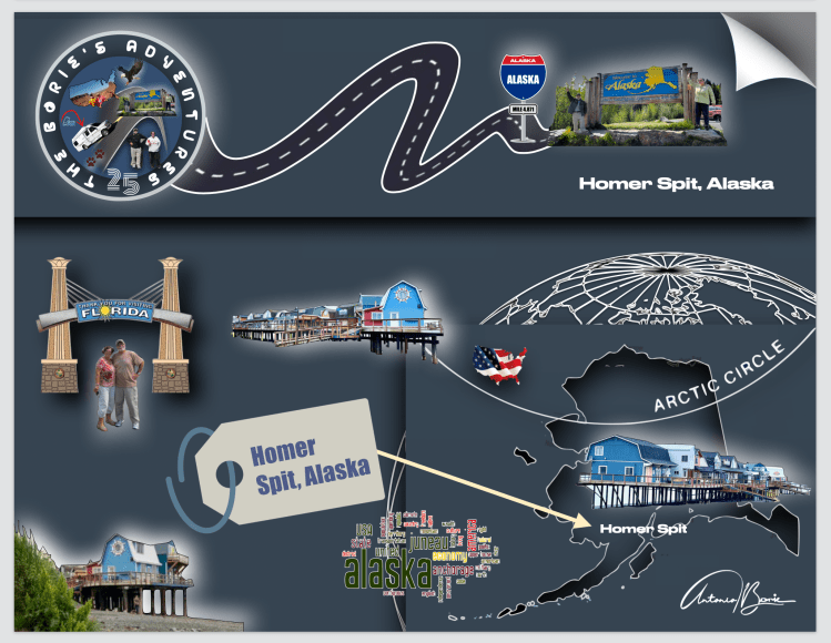 …”Homer Spit” é um fenómeno geográfico muito estranho!. O terreno circundante do continente é acidentado, mas a ponta em si não é muito mais do que um banco de areia, embora seja um banco de areia incrível que se estende por quase sete quilómetros até a Baía de Kachemak!. Ninguém sabe exatamente como se formou, seja por correntes de maré complexas ou pelo recuo de antigas geleiras!.