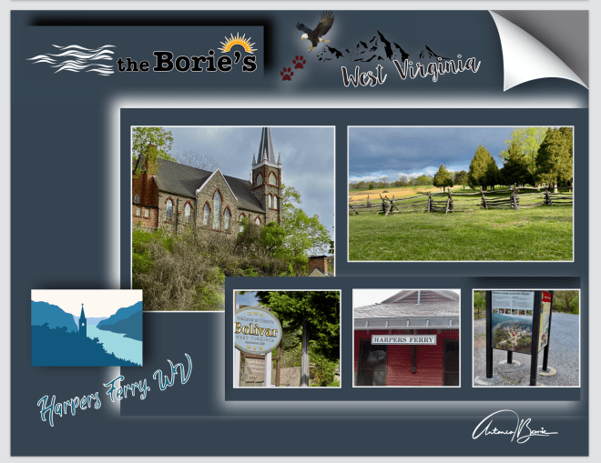 …vale a pena caminhar por aqui, onde a parte inferior e original da cidade se situa numa planície de inundação criada pelos dois rios, cercada por um terreno mais alto, fazendo parte do Parque Histórico Nacional Harpers Ferry, que inclui a área mais populosa, onde está incluído o distrito histórico, fazendo parte do Registro Nacional de Lugares Históricos e, adjacentes à cidade, estão o Baltimore e Ohio Railroad Potomac River Crossing e a Igreja Católica Romana de São Pedro!.