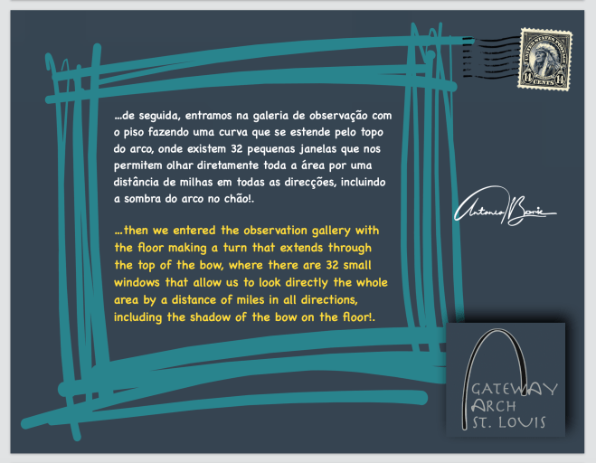 …subimos ao seu topo!. Este arco é uma estrutura única, com 190 metros de altura, construído com triângulos equiláteros de aço soldados entre si, com o formato de uma curva catenária invertida!. São 1.076 degraus que levam ao topo do arco… mas, felizmente, não precisámos de subir as escadas, em vez disso, entrámos num pequenino elevador, que comportam cinco adultos, joelho com joelho, onde as pessoas altas podem ter que se curvar um pouco, levando à volta de quatro minutos para chegar ao topo.