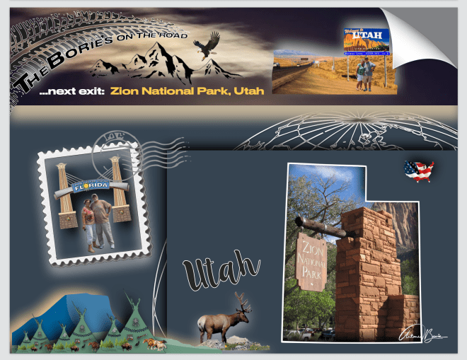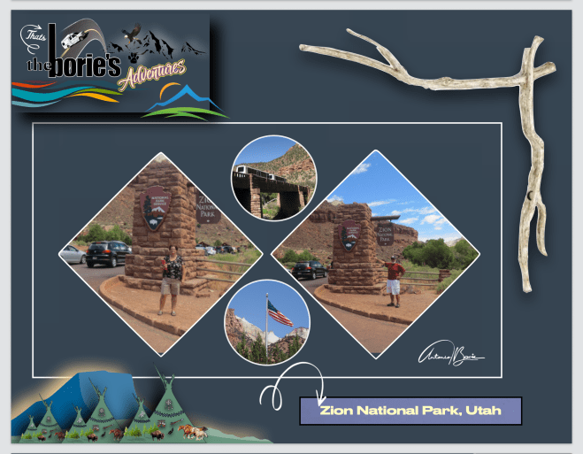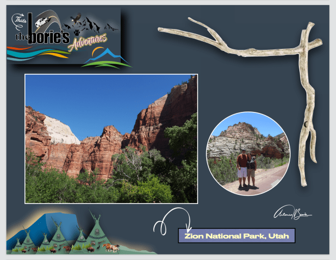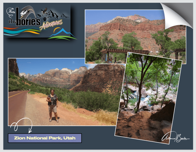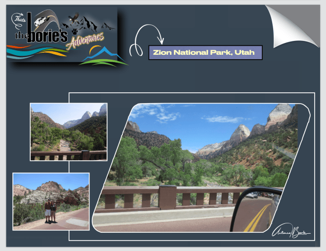 …assim, entramos no Zion National Park, que é um parque nacional que está localizado na junção das regiões do já referido Planalto do Colorado e o Deserto de Mojave, com uma geografia única, pois as paredes do seu desfiladeiro são de arenito Navajo avermelhado e marrom, corroídas pelo North Fork do Virgin River e pelos riachos na área, que seguem caminhos retangulares, desenhando cenários únicos de articulação nas rochas, que vão atravessando este parque com uma variedade de zonas de vida, que permitem uma diversidade incomum de plantas e animais!.