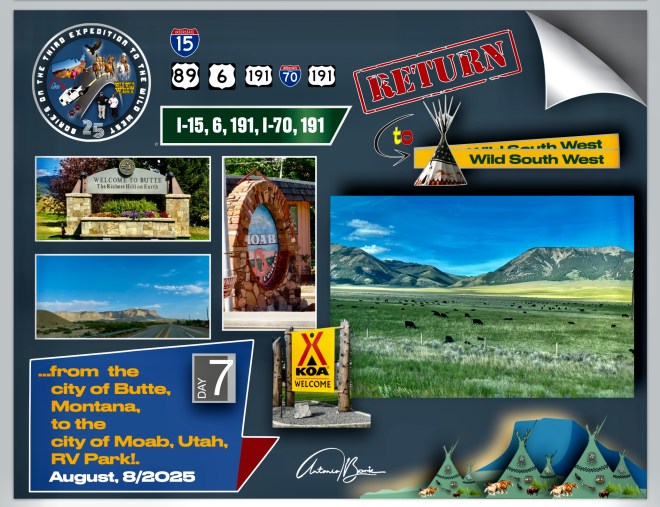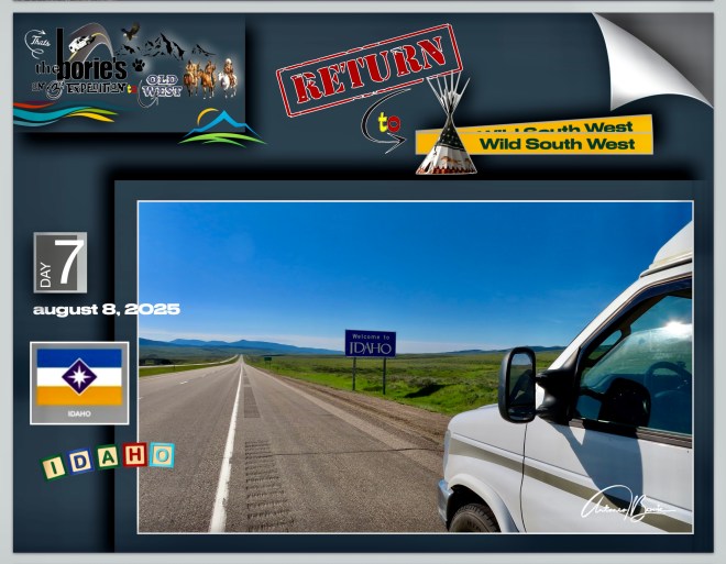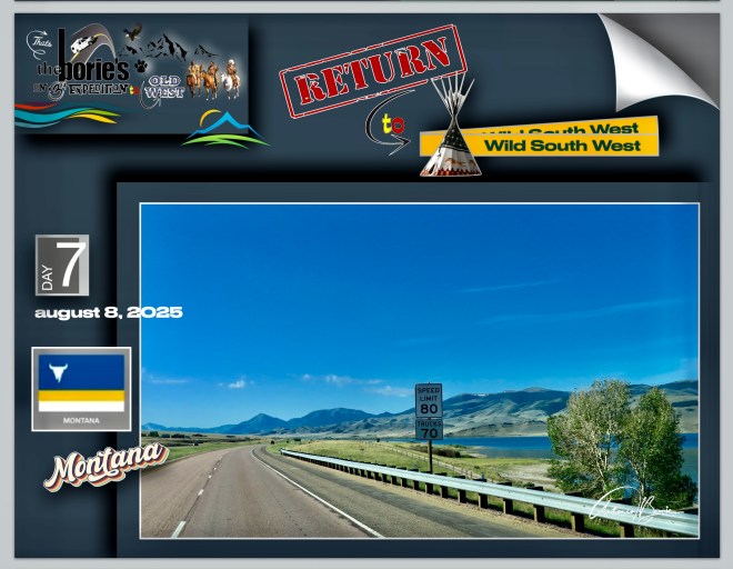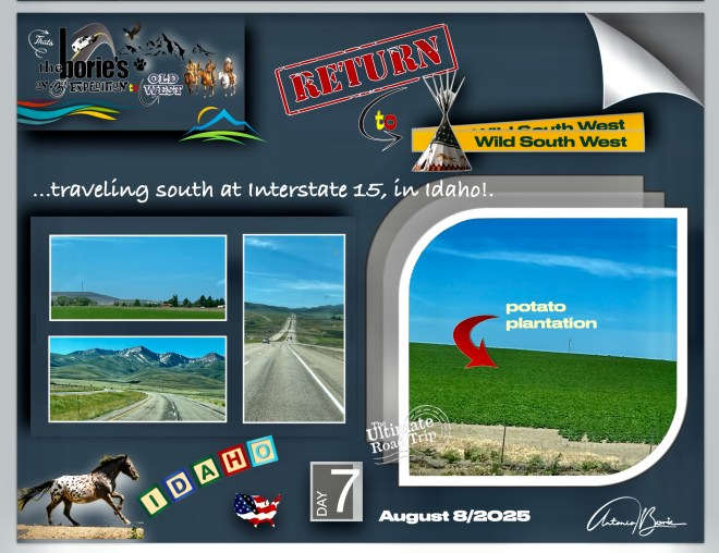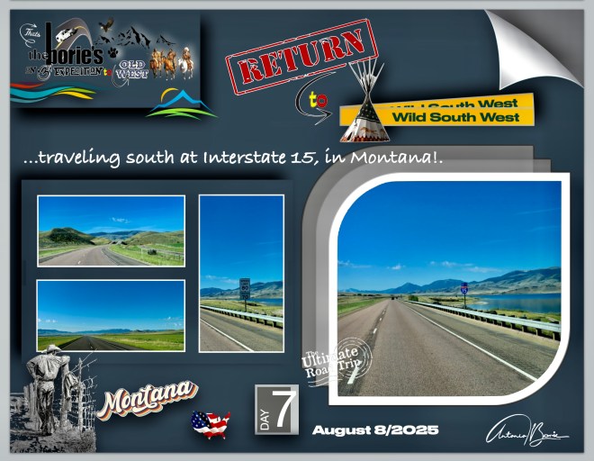 …wow, what a vent!. Now, let’s continue to describe our trip to the west!. Early on we abandoned our RV park in the city of Butte, Montana, traveling along the almost deserted Interstate 15 motorway, always towards the south, where the scenario was…, here and there, wavy fields with large beef spring cattle, small mountains and plains, where the green color was constant, and looking at the sky…, we could see an almost wonderful blue!.