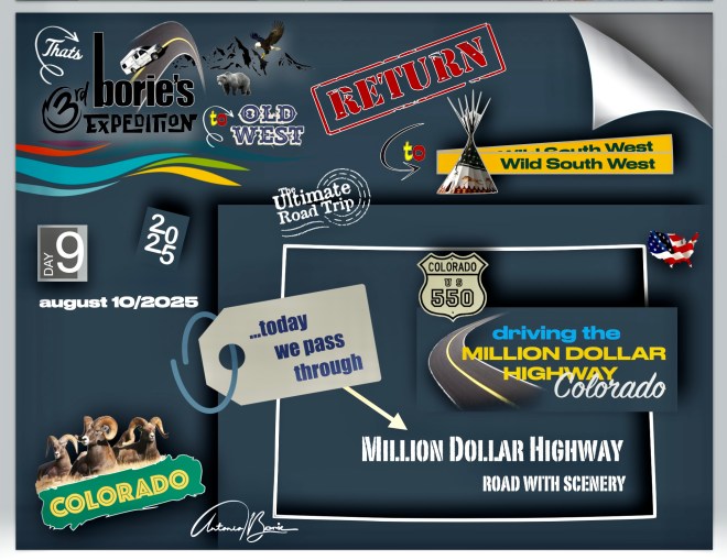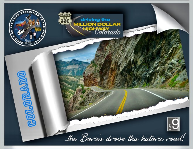 …esta “estrada de um milhão de dólares” é um trecho lendário, que atravessa as montanhas de San Juan, no sudoeste do Colorado, e geralmente é chamada de uma das estradas mais cénicas dos USA e um dos seus troços mais cénicos é entre as cidades de Silverton e Ouray, onde passa entre montanhas íngremes com quedas de água e sem guardas na sua beira!.
