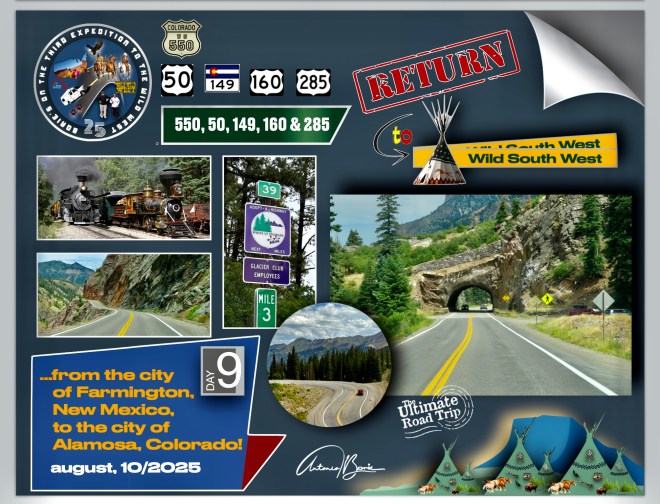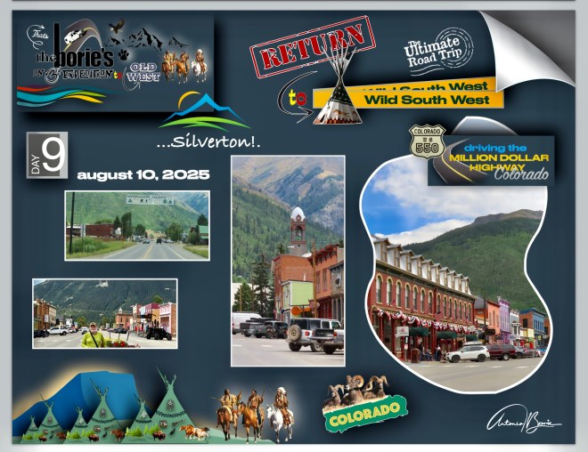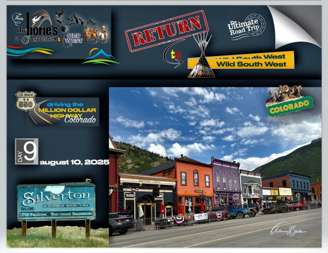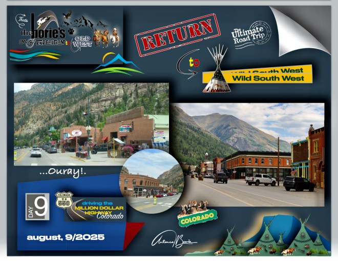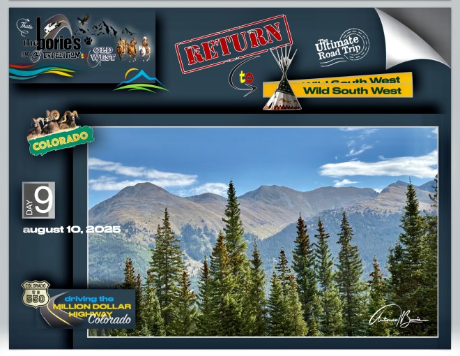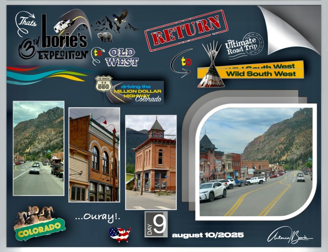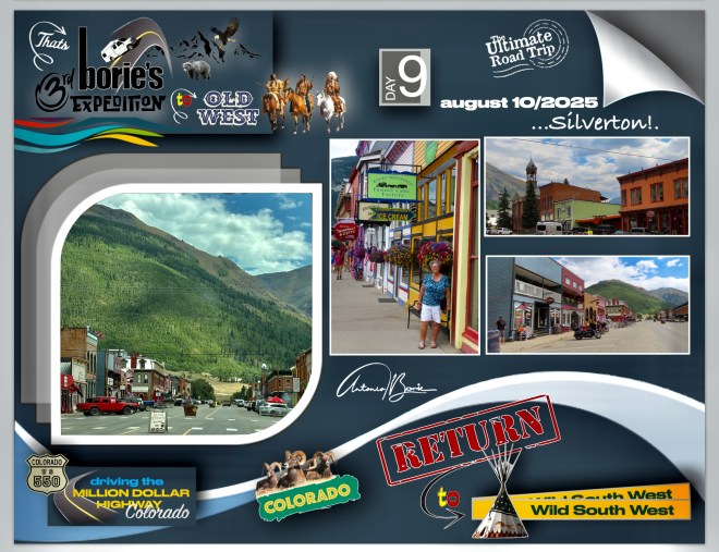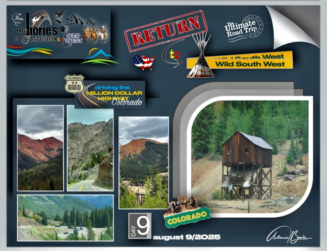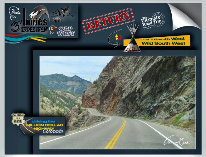 …nós, saindo da cidade de Durango pela manhã, viajámos ao longo de aproximadamente 110 milhas para norte pela estrada 550 no sudoeste do Colorado, que engloba a “estrada de um milhão de dólares”, atravessando o Red Mountain Pass a mais de 11.000 pés de altitude, parando onde era possível ver vistas deslumbrantes da montanha e nas cidades de Silverton e Ouray, (esta secção específica e traiçoeira é conhecida pelas suas quedas íngremes e faixas estreitas), e claro, sempre com atenção às suas curvas cegas!.